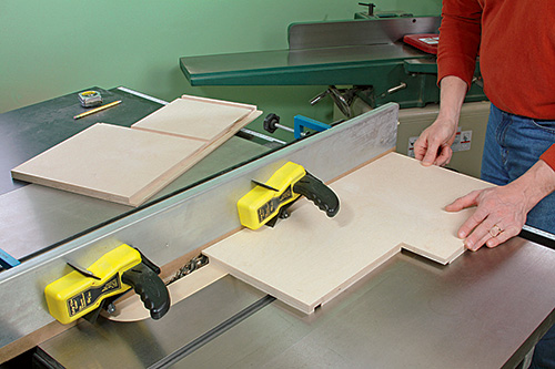 With these dadoes done, crank the blade up to 1/2″. Clamp a sacrificial facing to your rip fence, then position the fence next to the blade to mill 3/4″-wide rabbets along the back inside edges of the side panels. These will house the back panel.