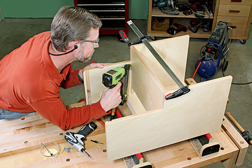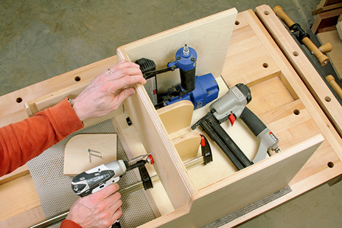 Before you can assemble your parts, chuck a 1/2″-diameter roundover bit in your router and ease the front bottom edge of the top shelf. Now clamp the shelf into its dadoes in the sides and use the shaped edge as a guide for filing the square corners of the sides to match the shelf. (You’ll also notice that the top shelf stops short of the back panel rabbet by 2-1/2″ — it’s no mistake. That gap makes room for the protruding nailing tips of your guns so they’ll rest flat on their magazines on the shelf.) Round over the bottom front corners of the side panels, too.
