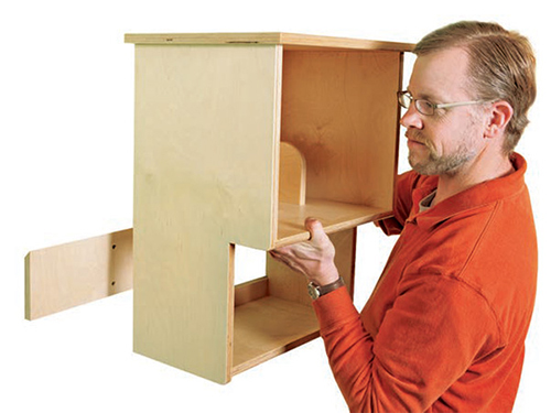 Avoid making the same mistake I’ve made before when assembling parts with French cleats: Your back panel’s beveled edge should face into the cabinet, not toward the wall. Fasten it into the side panel rabbets with glue and screws to bring these parts together. Then slip the top shelf into its dadoes and attach it with glue and brads.