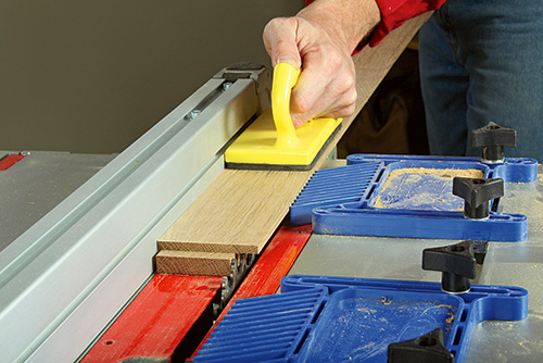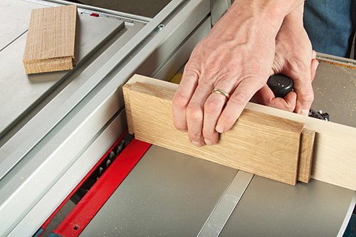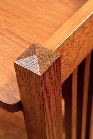 Now you can head to the table saw to cut pyramid tops on the legs. Tilt your saw blade to 18.5°, and make a series of four beveled crosscuts 1/4″ down from the top ends of the legs to raise the peaks. Use a sharp blade! Tip: hold the legs against a wide scrap fence on your saw’s miter gauge to support these cuts. Make a kerf cut through the fence to help position each beveled crosscut accurately. Or, start with a very long fence so you can clamp a stop block to register the leg bottoms instead.