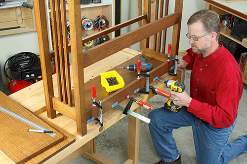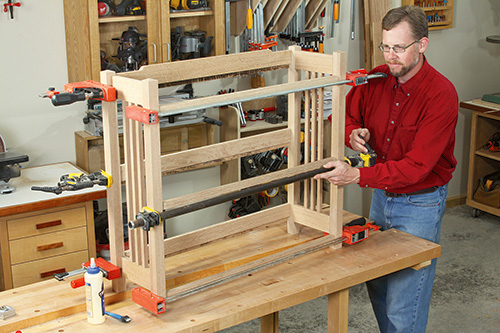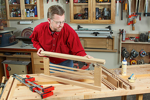Sand the legs, side rails and accent stiles up to 180-grit, and dry-fit the two side assemblies. If all seems in order, glue and clamp the parts together, checking the diagonals for square.