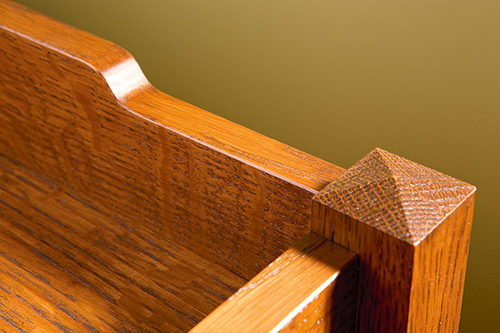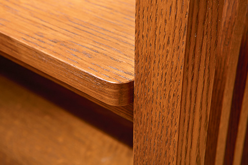 Set the frame aside for a spell, so you can edge-glue some nice quartersawn stock to make your three shelves (pieces 8), then rip and crosscut them to final size. Round their outer front corners with 1/2″ radii to add a subtle and attractive detail. Once you give the shelves a final sanding, all the bookcase parts are ready for finish — do it now while the shelves are loose. We used General Finishes Antique Walnut gel stain to mimic a traditional ammonia-fumed look, then topcoated with satin lacquer.