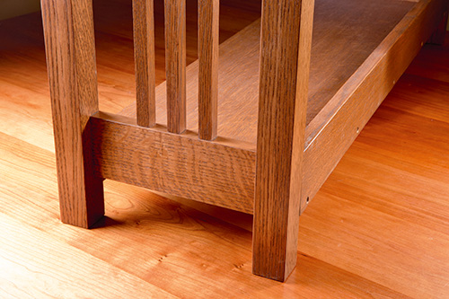 When the finish dries, drive five countersunk flathead wood screws through the tongues of the back stretchers and into the back edges of the shelves to pin them in place. Follow this with three or four 1-1/2″-long countersunk wood screws driven up through the front shelf supports and into the bottom faces of the shelves to secure them in front. Since these quartersawn shelves will expand and contract through their thickness and minimally across their width, unlike flatsawn stock, don’t worry about wood movement issues by anchoring the shelves widthwise and restricting them. All will be well. Enjoy your new bookcase!