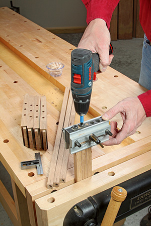 Wrap up the parts you’ll need for the bookcase’s two side assemblies by making the six accent stiles (pieces 3) from sticks of 5/8″-square stock, with 11 ⁄ 16″-deep holes bored into both ends. Gang-clamp the stiles several at a time in your doweling jig to hold them squarely and evenly while you drill the centered dowel holes. Cut 12 dowel pegs (pieces 4) from a 5/16″ rod and chamfer their ends to make them easier to tap into place.