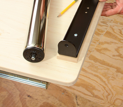 When you study the Drawings, you’ll see that the outfeed table must be positioned low enough to close up inside the cart and accommodate for the height of the roller hardware — the top curve of the roller has to be even with or slightly lower than workpieces exiting your planer. All of this considered, I determined that my slides could be located 1″ down from the top inside face of the cart top. Then, I could shim the roller up as needed to suit my planer’s bed height. So, I used a long 1″-wide spacer to align each slide on the side panels while I drove the attachment screws. Position the ends of the slide housings flush with the back (outfeed) end of the cart when fully closed.