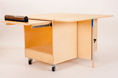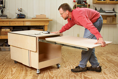 Our planer cart is sized to fit most benchtop planers on the market. It features two tip-up wings on either side that rest on pivoting supports when needed and hinge down flat when you’re done. Finally, a place to park that lumber when processing it! For really heavy loads, we’ve provided drop-down braces on the ends of the supports with locking hardware. Behind the cart, an outfeed table pulls out on full-extension drawer slides. It provides nearly four feet of “helping hand,” with a ball-bearing roller to catch the stock as it exits the machine. No more sprinting around the planer to grab boards at the end of each pass. You can extend the table all the way for really long stock, or retract it some to suit shorter material. A lower shelf will stow even more lumber or other shop sundries, and the cart rolls into position or out of the way on swiveling and locking casters. Pretty cool, huh?