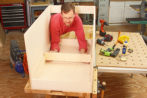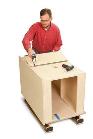 Tote all of your carcass parts over to the workbench for a thorough sanding up to 150- or 180-grit. It’s much easier to smooth these surfaces now while everything still lies flat and open. Once the dust clears, you can fasten the side panels to the base with glue and countersunk wood screws. I first tacked the sides into place with a few brads, then followed behind with screws. Slip two ends into position on the base, and locate the third end piece at the top rear corner of the sides to help the carcass resist racking. Secure these parts with more screws.