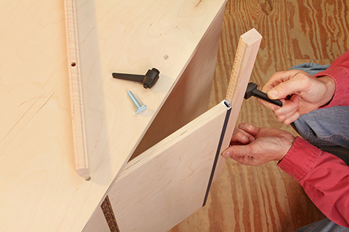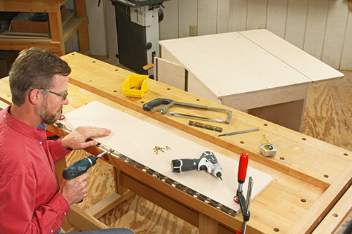Notice in the photos that the lever knob hardware holding the extendable braces up or down mounts on the aluminum T-track (pieces 8). Mark two strips of T-track to length. You can cut it quickly and accurately at the miter saw or table saw, but be sure to wear eye protection to protect against metal shavings. Ease the sharp corners of the tracks with a file, then screw them to the other long edges of the supports. You’re ready to mount the supports to the carcass at this point. Just center the supports front to back on the side panels and flush with the top and bottom edges. Screw them in place. You can face the hinge knuckles forward or backward, depending on how you want the supports to fold up; either way works fine, but arrange both supports to fold in the same direction for convenience.