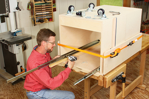 Hopefully, your helper is still within earshot to help you flip the project upside down on your bench … I found that to be the easiest way to install the rather heavy full-extension drawer slides (pieces 16). But first, grab a length of rope or a ratcheting tiedown to hold the wings closed before inverting the cart.