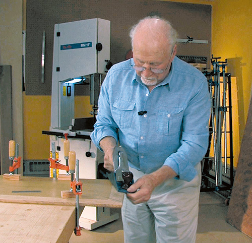 With that completed, the top is the next logical component to make. You already selected material and butt joined the stock for the top. Now cut it to size and get ready to form the bevel on its underside. Once again, a plane is my tool of choice for this task. Alternatively, you could shape the bevel on your table saw or with a large-diameter router bit. With the bevel in place, shape a gentle radius on the same three edges of the top. Then, clamp the top in place and mark and drill holes through the top ledger and top dovetailed rail for your screws. Secure the top to the carcass, then remove it and set it aside for now.