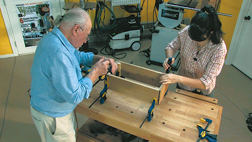 One of the points I make in The Way to Woodwork DVDs is that gluing up is a process that strongly benefits from a second person’s set of hands. Gluing and clamping is essentially an irreversible step, so avoiding mistakes is critical. To glue and clamp the back and sides, I asked LiLi Jackson to assist me. Each step was discussed and we walked through them so that the assembly was well understood and done accurately. Once the sides and back have been glued and clamped, the dovetailed rails can be made and joined into the side.