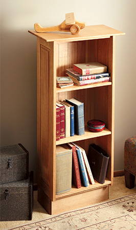 This elegant little bookcase combines three frame and panel subassemblies with a top, bottom and a base. Two adjustable shelves sitting on shelf pins complete it. As woodworking projects go, it is not overly challenging in its joinery. Its proportions allow that, if attractive lumber is selected and care is taken in its construction, you will have an elegant and practical piece of furniture for your efforts. In designing it, I tried to exemplify the three major tenets of the British Arts and Crafts Movement: