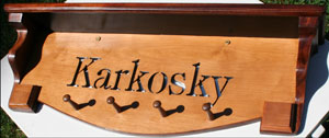 The sign-shelf-coatrack was at the request of a friend, for a family member who was getting married. The lettering is complements of a Bosch barrel saber saw. It’s cut into plywood, the edge of which was banded in African Mahogany, to match the two supports. The shelf is a plastic heavy composit material. The entire project was finished with three coats of amber shellac (Bullseye), polished with fine steel wool, then waxed.