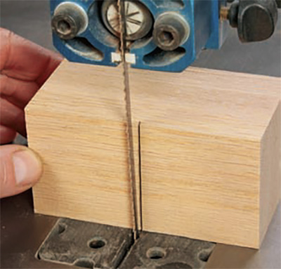 Every now and then, it’s a good idea to check your band saw table for squareness to the blade. Here’s the quick method I like to use: take a piece of flat, square-edged scrap and cut a shallow kerf into one edge. Now pivot the block around so the kerf faces the back of the blade.
