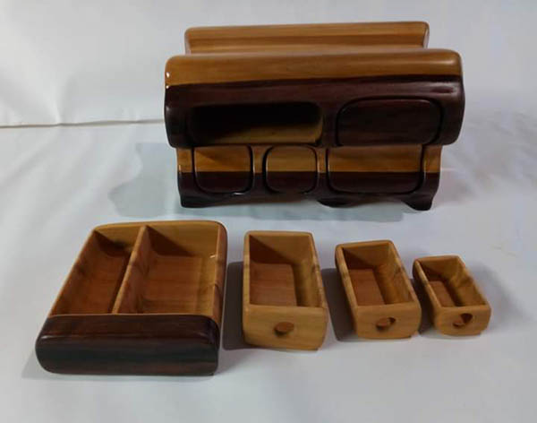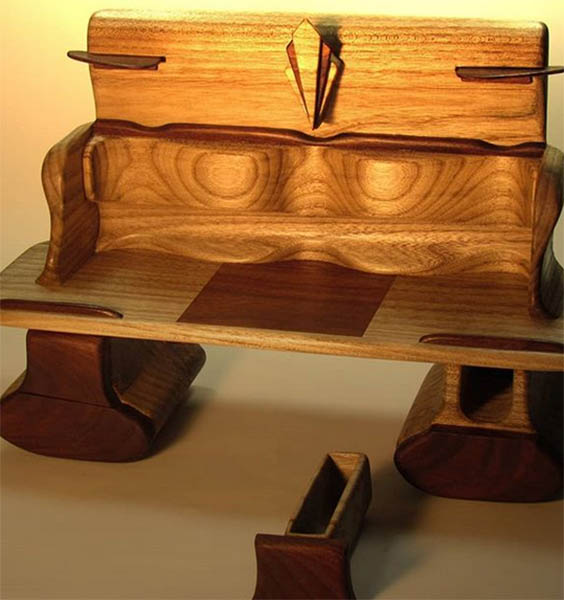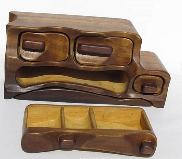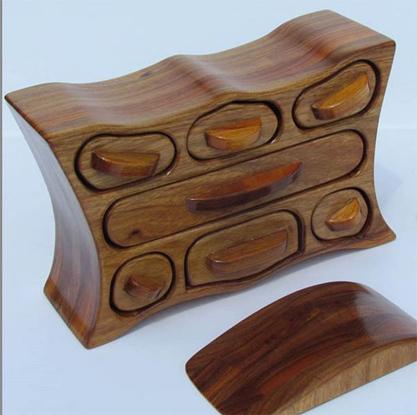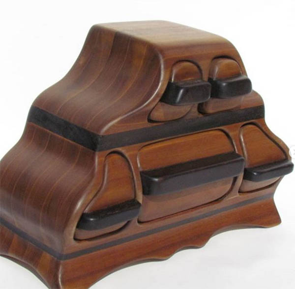 He got started with the jewelry furniture after submitting a few pieces to a University of Cincinnati exhibition with the theme of “furniture.” Those boxes were styled to resemble various styles of desks, such as a rolltop desk and a secretary style desk.