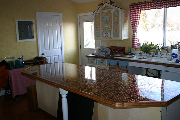 “I’m including a photo of my current countertop, made of flooring slates over a base of 3/4” exterior plywood clad with cement backer board. I did need to use a tile saw to miter the corners and make skinny slabs to cover the backsplash and the edges of the counter. The cabinets themselves are no great shakes, Home Depot off-the-shelf units because my good woodworking tools are presently in a storage container waiting for the workshop we started building a year ago to be finished. Some day, the particleboard bases will wear out and I will have some nice hickory face frames and doors to put on a new set of finished plywood bases but until then, these will do the job.
