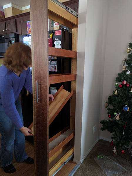 “I have built cabinets and am not afraid of them one bit. I have built full kitchens for people along with a lot of different stuff. The last item I built was for my daughter for Christmas. There was about 7.5 inches of dead space between her refrigerator and the wall that needed something. I drew up plans (I enjoy using CAD for design) and put it together. The shelves are adjustable so she can have the right height for her goods.” – John O’Brien