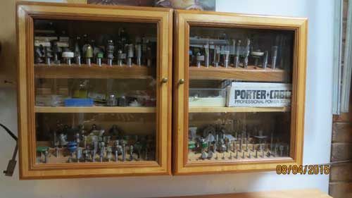 “I built a cabinet with glass doors to hold most of my bits. Have never counted them, but quite a few. I have other sets, but they are in the small storage boxes that were usually supplied with the bits. The cabinet is 16″ x 28″ x 6″ and has three shelves, one dedicated to 1/2″ bits, one to 1/4″ bits and one for collars, bearings, collets, etc. The shelves are sloped and stair stepped to allow easy spotting of the bit I need through the glass doors. I ran into the dilemma of storage of router bits many years ago and this is my solution.” – Dave Arnold