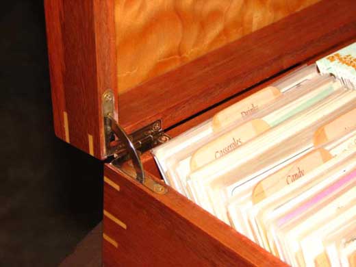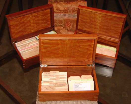 These recipe boxes were gifts to my wife, son and daughter this Christmas. There is one each of African Mahogany, Lyptus and Cherry with Quilted Maple tops. The corners are splined miters and the tops are raised panels.