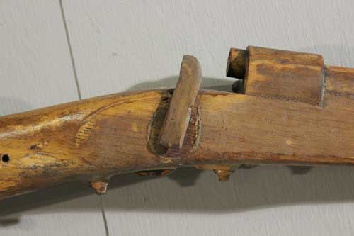When conservator Melissa Carr started the project, she did a thorough evaluation of the frame, which was actually two frames, one inside the other. There were three phases: cleaning, stabilization and loss replacement. She also had to analyze the carvings. Were the carvings of the military equipment replicas of actual weapons or simply approximations of carbines, sabers, etc.? The carbine, for example, was missing the trigger, trigger guard, sight and hammer assembly. The Internet was a valuable resource, yielding photographs in enough angles to be able to reproduce the missing parts and identify it as a Joslyn .52 caliber carbine, model 1862 or 1863. Whoever carved it had also carved the backs of the attachments as well as the front. They were in 3D, even though those sections would not be seen.