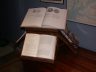 Years ago I visited Monticello and was impressed by the bookstand that Thomas Jefferson had designed for his library. It folds down into a one-foot cube and opens to hold up to five books simulataneously. My woodworking skill was not up to tackling such a project at the time, but commercial replicas cost between $1,000 and $2,000, way beyond my means. Now, 10 years and many projects later, I finally gave it a shot. This is the result. I made it from solid oak, with a commercial lazy-susan bearing and brass hinges (the only metal in the project).