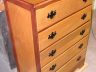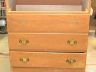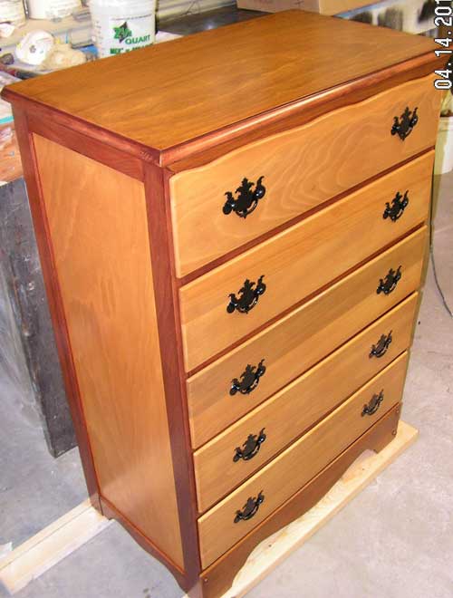 This is a simple dresser I restored. It’s all solid wood including the drawers which are dovetailed; the side panels and top are ply for strength and stability. Took about 12 hours from start to finish; no power tools used; hand scraped and sanded. The drawer fronts and top have a golden maple stain. The side panels have no stain and the framing is a rosewood stain. I finished by spraying on five coats of precat lacquer via hvlp sprayer. The original picture shows a missing drawer; I had already stripped it; as a test when the picture was taken. Also I picked it up for only $25 at a local thrift shop.