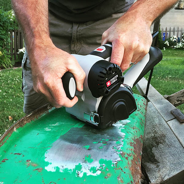 So, in search of a cheap power supply, Robert purchased a $20 angle grinder from Harbor Freight, ripped its gearbox off, and installed it on a metal frame fabricated by fellow employee and former Delphi Electric tool and die maker Rich Schley. That kind of early version of the Restorer tool  “worked amazing on metal,” Robert said. And, while he doesn’t call himself a woodworker, he does say, “I’m a DIY guy.” He had built his own wooden patio, which needed refinishing every year after being exposed to the elements in Ohio. In order to tackle the flaking wood on his patio, Robert decided to bring his tool home and try it out.