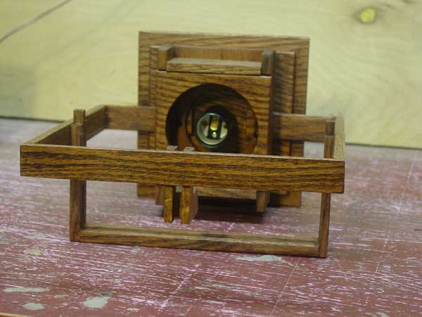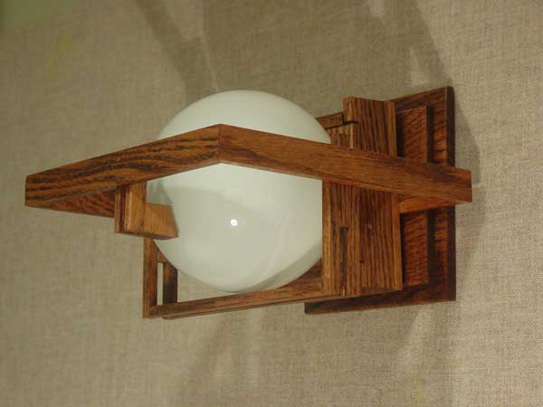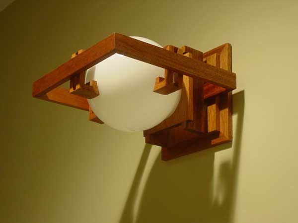 I made the sconces based on the Robie House dining room sconces. First I did CAD drawings of the original sconce and built two of them to prove the design (first photo below). Then I built the version I designed as you see in the photos. I made some out of red oak and some out of Honduran mahogany. I have designed and built many different Prairie-Style lighting fixtures and furniture, but the Robie sconce was always my favorite light fixture ever.