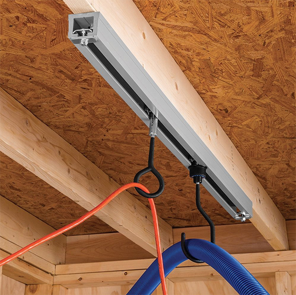 The pair of hooks keep your power cords and a vacuum hose off the ground or workbench, but trolleys enable them to roll freely along the track so you can sand, saw and rout without fighting with them. The hooks can also be used to hang tools and utility lights or cabinet and other small doors for finishing. Made of PVC, the track will hold up to 60 lbs. of total weight, and each of the hooks has a 20-lb. load capacity.