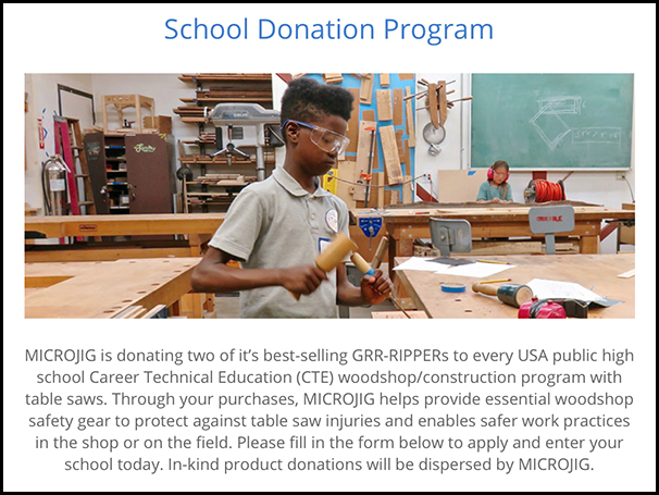 The company showcased its dedication to safety last year with the unveiling of its high school donation program at the International Woodworking Fair in Atlanta. Microjig aims to empower the next generation of woodworkers by providing accessories to keep them safe in woodworking programs. The terms of the “Safety for Every Shop Program” are simple: any public high school in America that has a Career Technical Education (CTE) program offering woodworking and construction courses is eligible to receive two GRR-RIPPER 3D Pushblocks (model GR-100) at no cost by filling out an online application form.