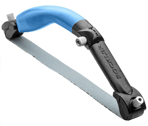 The tool’s glass fiber construction with rubber overmold ensures durability as well as a comfortable grip. Its two-piece handle has a toothed hinge for setting belt tension or to fold the bow up conveniently. When fully extended, the handle is 12-1/4 in. long, and it is 8-1/4 in. when folded up. Tool-free knurled knobs on both ends of the bow engage or release the handle clamps for replacing sanding belts. Rockler recommends using only cloth-backed sandpaper with the Sanding Bow, in lengths of 11-1/2-, 12-1/2- or 13-1/2-in. Sanding belts aren’t included, but you can purchase it in a Woodturner’s Multi-roll Sanding Pack (item 22134) for $19.99.