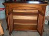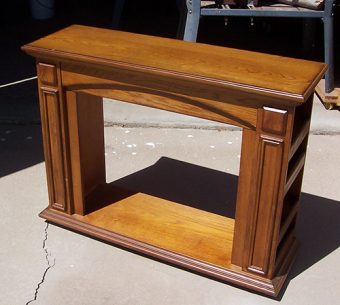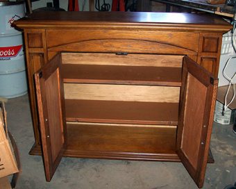 I volunteer at the St. Vincent dePaul thrift store in Prescott, Arizona. Someone donated a large electric room heater in a large wood frame. The heater didn’t work so they were going to throw out the whole unit. I took the heater unit out, made doors, installed shelves and put a back on it. We put it out in the store for sale and it sold the next day. I made the double door frames from old oak wood stained with special red oak stain. The center panels I made from white oak stained with maple stain.