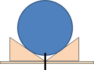 “For Mr. Schroeder’s ball routing problem, my solution would be to build a cradle on a thin sheet of plywood to mount over the router bit on his router table. Use 4 wooden triangles to support the ball in both directions (mount them so the ball will rotate in any direction, but the bit will always point to the center of the sphere). The view shows one-half of the setup; there would be another set of blocks at 90 degrees to this.