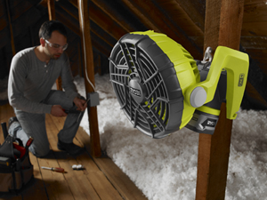 Working up in a hot attic, a stifling shed or in your shop without air-conditioning can make the job unpleasant. But, Ryobi’s new 18V ONE+™ Dual Power Portable Fan can help move the air, and keep you cooler, wherever your worksite happens to be. Released last month as another option in Ryobi’s expansive platform of ONE+ cordless