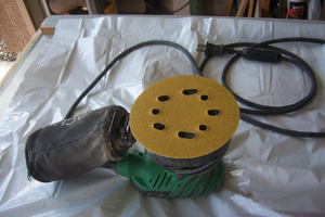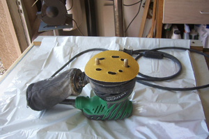 I thought of this easy way to align my sanding disk’s holes with the sander. I used 3/8 dowels, rounded the ends, and inserted them into the sander. Just slide the disk over the dowels and the holes align perfectly.