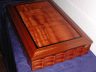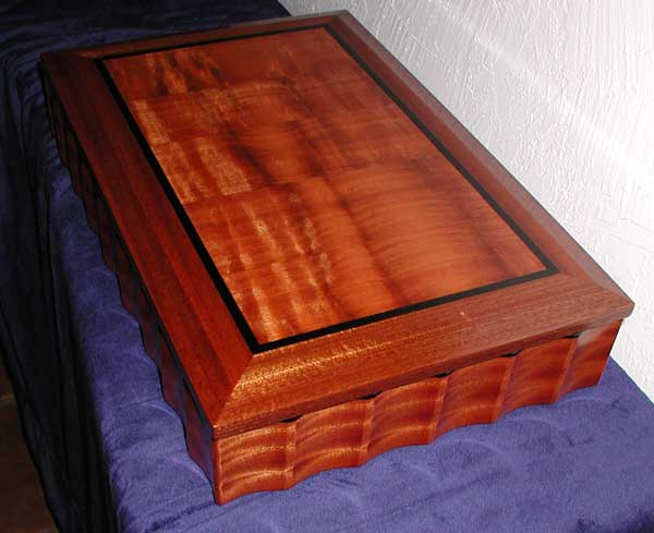 Here’s my third humidor I just finished. Scalloped sapele hardwood, ebony trim accents, and makore veneering on top. Interior is 3/8″ spanish cedar grooved for humidity circulation. (17″x 4″ x 12″)