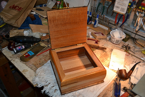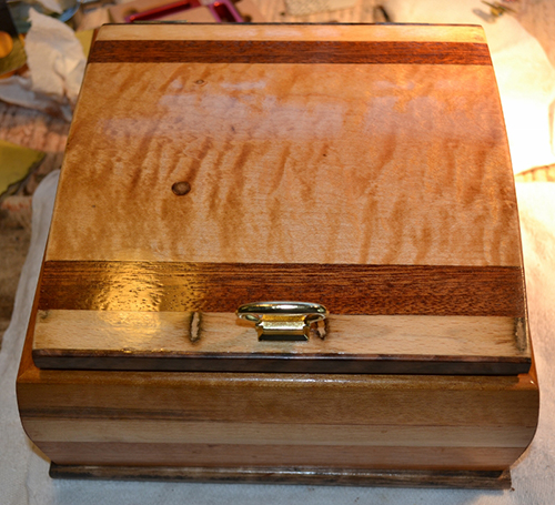 As most woodworkers do, I have a pile of off-cuts from other projects. I love making boxes of all sorts, so I scrambled through my box of small scraps from other, bigger projects and made this box as I went along – no plans. I tried many different skills, like French polishing and mitering things with curved surfaces, and came up with this ‘scrap box’ and used it as a learning experience for future projects.