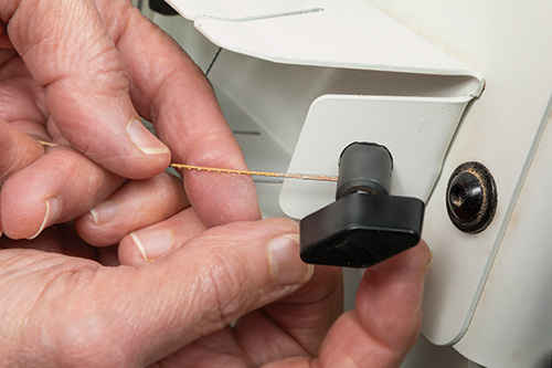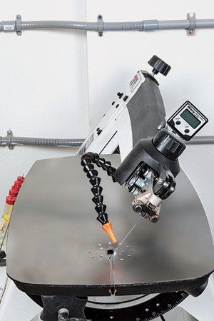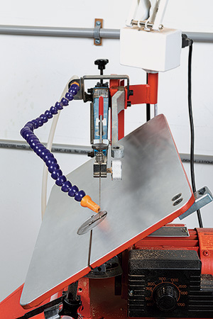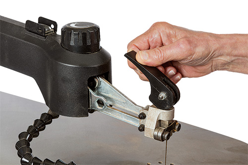 Blade clamps — upper, lower or both — can be either attached to the saw or removable. This feature is relevant for those who do fretwork, which involves feeding the blade through small holes drilled in the workpiece. Those who prefer to insert the blade from the top down, or “top feeders,” need a saw whose lower clamp can remain in place when the bottom of the blade is detached. To “top feed,” the scroller detaches the bottom of the blade from its holder, leaving the top end attached, and feeds the blade through the drilled hole in the workpiece and the opening in the saw table. The blade is then reattached to the bottom holder. “Bottom feeding,” done in the opposite direction, can be done with all saws, since the upper end of the blade is always detachable with its clamp in place.