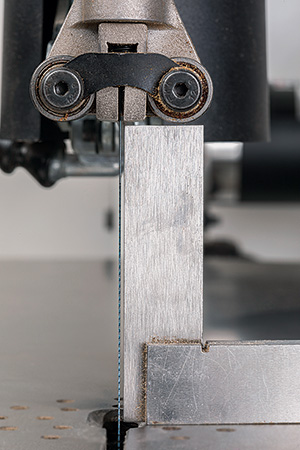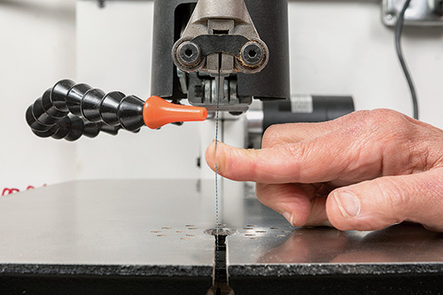 For accurate cutting, the blade must be properly tensioned. Too much tension and the blade will snap; too little and it will wander. I tension mine so that there is a slight deflection, no more than 1/8″, when the blade is pushed sideways, being especially careful not to over-tighten fragile, wire-thin blades. Blades are routinely de-tensioned when not in use, and the better saws have a quick-release mechanism at the front of the saw that lets you de-tension the blade without losing the setting.