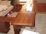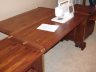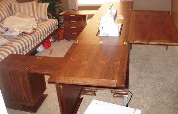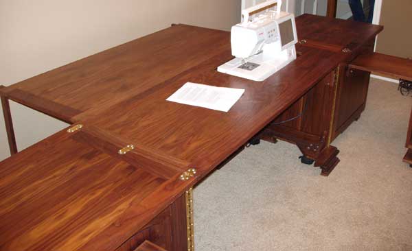 The sewing machine is on an electric lift that can be activated by a rocker switch. There are two roll out auxiliary tables that are sitting on the left and right of the work area that stow under the top when the unit is folded up. The entire unit including the auxiliary tables is on casters. The rear drop leaf has a rule joint and folds down into a recess in the back and is virtually hidden when folded down. I took this job on with just a general sketch and many of the fine details on how to achieve one design item or another usually came to me about 3:00 am.