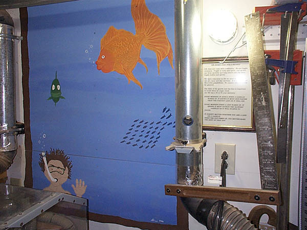 “I built a small, 150 square foot shop 18 years ago. After commenting that there was no window in my shop, my daughter offered to paint one for me. There were no limits as to what would appear in the window, so she came up with this underwater scene. She completed it before leaving for her senior year at New York University in 2000. Even though wall space is at a premium in my shop, that is one section of wall that will never be covered.” – Bob Hartig