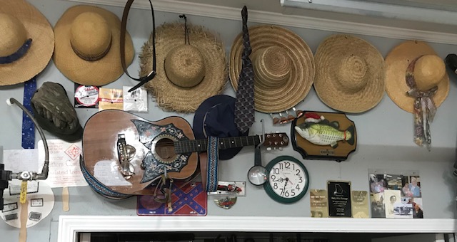 “I have several pieces of ‘art’ on my walls. Two bow saws, one antique and one that I made. Also, I have a very old leather golf bag that probably dates to the 1920s. One more thing that is dear to my heart that is hung on one wall is my dad’s broken kayak paddle. It’s a handcrafted wooden paddle that he broke during a whitewater kayaking class that we took together. Everyone in the class and the instructors signed it after it was broken. Dad was 78 years old when we attended the class at the Nantahala Outdoor Center in North Carolina.” – Lee Brown