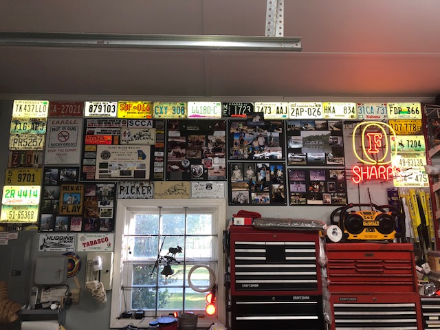 “Since the shop wall art of my parents lives turned out better than I anticipated, looking at it made us happy! I decided to clean off another wall and display happy photos from my own past, car license plate collection, hunting and fishing photos, sports car club items, or photos of my houseboat, childhood and family photos and happy time photos with my wife and friends.