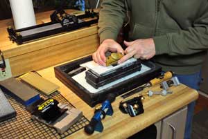 I’ve never been particularly adept at sharpening my edge tools (chisels, plane irons, etc.). It’s not that I couldn’t get them sharp enough to work, it’s just that I’ve always experienced inconsistent results. One time, I’d get a blade so sharp, it simply glided through hard oak and maple. The next time I sharpened that blade, I’d be lucky if it didn’t tear its way through soft pine. Freehand sharpening always seemed like something that would take decades to get right (an opinion no doubt influenced by the fact that the best tool sharpener I know has made nearly 95 trips around the sun). The trick seems to be locking your wrists and fingers as you pass the tool over the stone, to keep the honing bevel at the same angle during every pass. Fail this, and you end up with a rounded bevel face and an edge that’s none too sharp. Yes, hollow grinding helps, as the tip and heel of the bevel are easier to keep flat on the stone. But unless the tool has a wide bevel, like a big chisel or heavy plane iron, even hollow grinding is no guarantee.