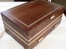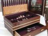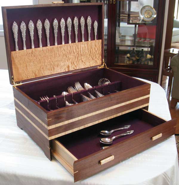 I built this silverware cabinet from black walnut my Dad and I harvested from the family farm in the 1960s when I was 12 or 14 years old. It was slabbed out and air dried in a barn for over 40 years. The other woods are spalted maple and curly maple. I purchased the inlay from Rockler.