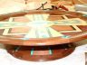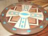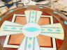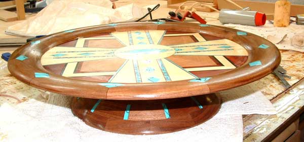 This southwest-style serving platter is about 20″ in diameter x 5-1/2″ high. It is constructed from Acrylic, holly, bloodwood, black walnut, cherry and gabon ebony. It contains 494 pieces most of which use epoxy as a bonding agent rather than glue since most glues will not stick well to the acrylic.