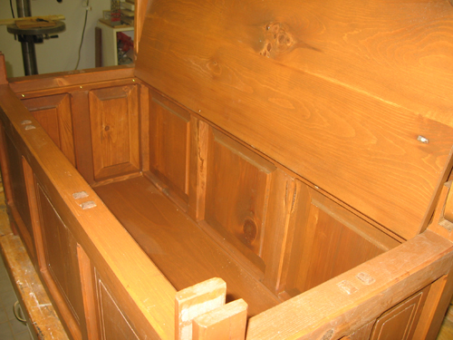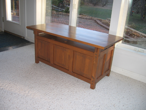 I thought you might like to see my version of the southwestern entry bench (Woodworker’s Journal Dec 2008). I didn’t have access to any mesquite, but I did have some 2” and 1” rough cut 100 year old bard boards. I have a great appreciation for the workmanship of Frank Grant. Hand chiseling nearly 50 mortises, when 1/32 of an inch off would not allow things to fit, was quite a feat!
