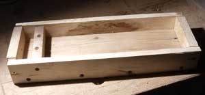 Find a board the same width as the chisel holder. Measure the length of the chisel holder with chisels in it and add 3-3/4″. Cut the board to this length. Now cut two 2” wide boards to this same length and screw them to the sides of the first one. Cut two small pieces of wood as wide as the