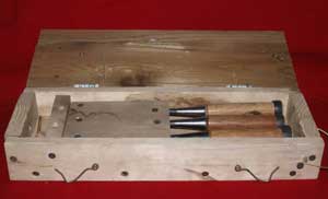 With the addition of a lid to keep the chisels in the box, I could add a hanger and hang the box on a hook. This completes the chisel rack. Now, not only do you have compact protection for your expensive chisels, but you can live by the motto that “The edge is never dull.”