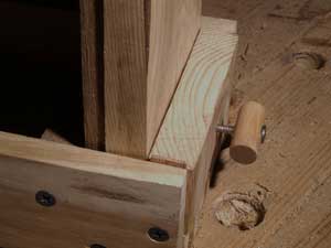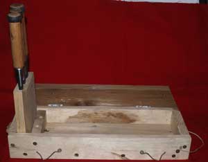 wood as wide as the chisel holder is thick and 1-1/4” long. Stand the chisel holder up against the end of the box, push the block of wood against it and mark where it goes. Take out the block, pre-drill screw holes, and screw it in place. Mark a location for the pin on the end of the box where it will not hit any screws. Because the chisel holder is 1-1/4” longer than the slots, it is impossible to hit a slot. When you have found the right location, drill a hole for the pin. I used an ordinary 16 penny nail and a 9/64″hole. Although the nominal size of the nail was .131, there were burrs near the point that needed to be removed before it would fit. Unless you possess a set of hole-shrinking drill bits, you should make enlarging the hole your last resort.